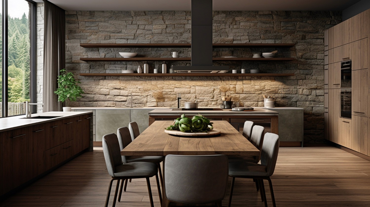 Cozy rustic kitchen with reclaimed wood cabinets, a farmhouse sink, and natural stone countertops.