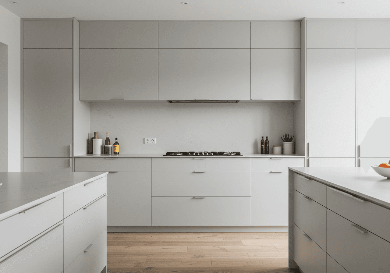 Sleek kitchen with quartz counters, white cabinets, and built-in stainless appliances for a clean, modern look.